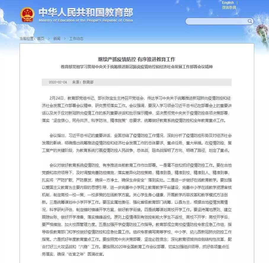 教育部召开党组会,传达学习中央关于统筹推进新冠肺炎疫情防控和经济社会发展工作部署会议精神,研究贯彻落实工作。