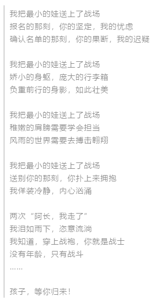 医疗队出发后,她写下了一首诗《我把最小的娃送上了战场》:
