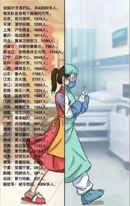 这是疫情发生以来,全国31个大医疗队,驰援湖北的人数表,人们用心地给每个省都取了很棒的队名。