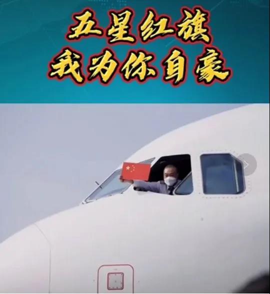 飞机落地后,机长打开驾驶窗口,挥舞五星红旗。