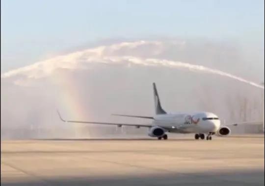 航班抵达济南遥墙机场,消防队打出2道水门,寓意“接风洗尘”。