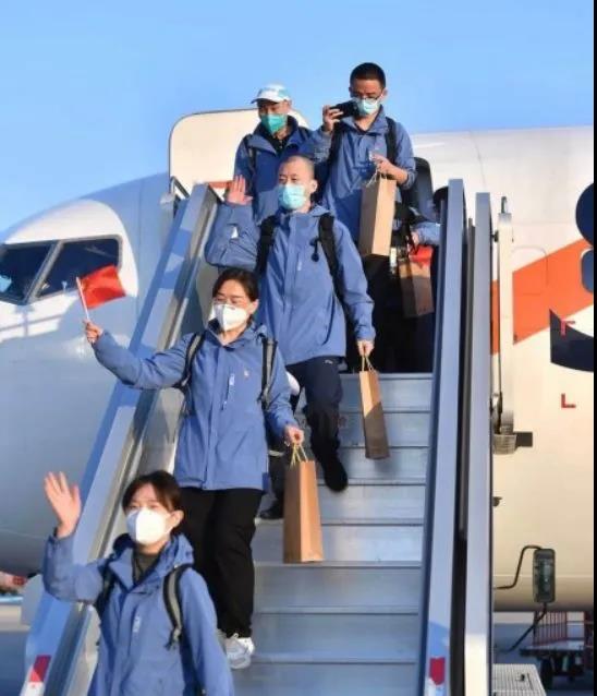 医疗队走下飞机,队长吕涌涛高声汇报: